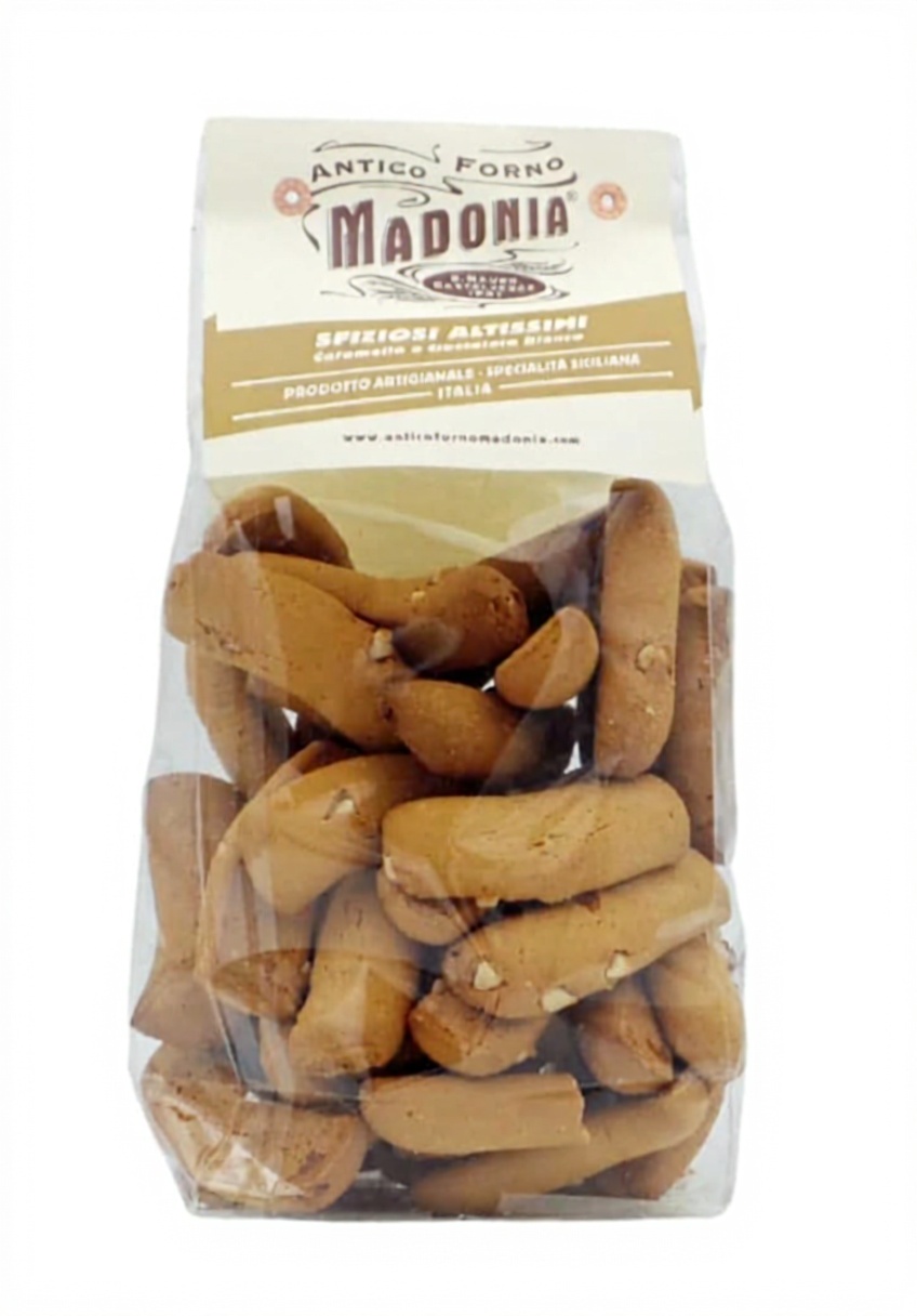 I Biscotti Antico Forno Madonia Sfiziosi Altissimi sono una prelibatezza artigianale che combina caramello e cioccolato bianco in un equilibrio di sapori. Realizzati con farina di frumento, strutto, uova e latte, questi biscotti offrono una consistenza croccante e un gusto ricco, frutto di una tradizione dolciaria italiana.