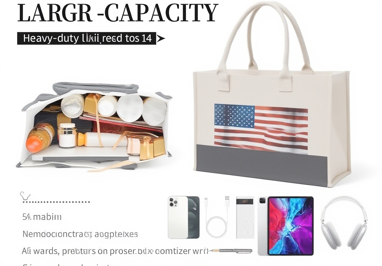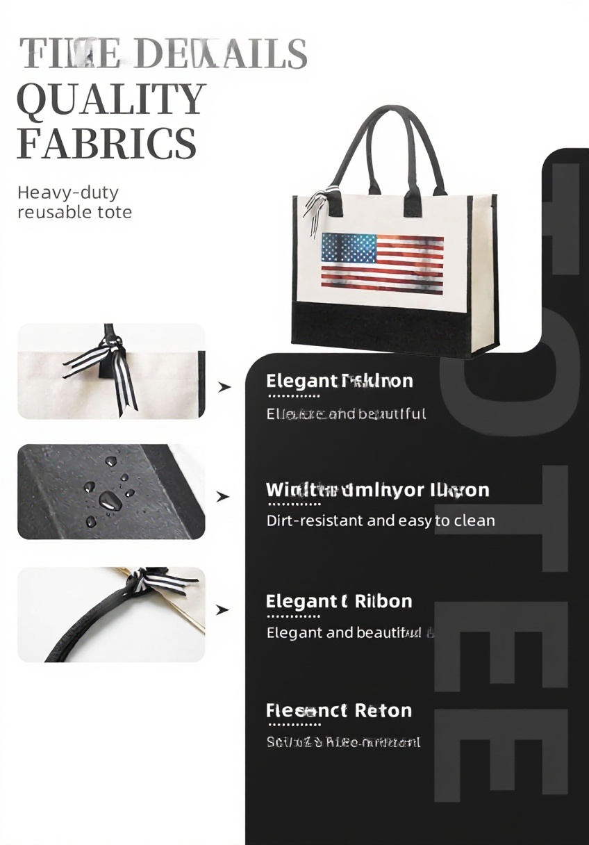 Questa borsa per la spesa WANLON si distingue per il design vintage con stampa a doppia faccia della bandiera americana, che la rende unica ed elegante. Realizzata in tela rivestita da 10 once (60% cotone, 40% poliestere), garantisce resistenza e longevità per un uso ripetuto, offrendo un’alternativa ecologica ai sacchetti di plastica e carta.
