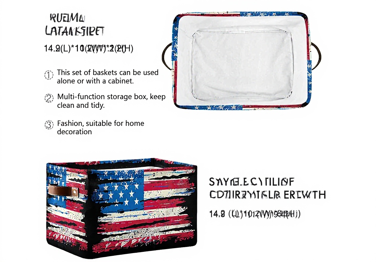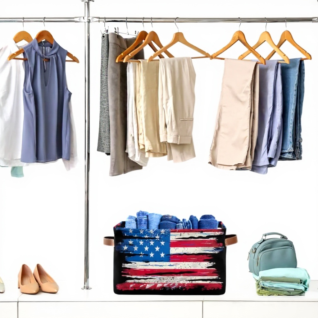 Questo cesto portaoggetti vintage unisce stile e funzionalità, caratterizzato dal design a bandiera americana che aggiunge un tocco retrò agli ambienti. Realizzato in tela ispessita per garantire robustezza e durata, è dotato di manici laterali in pelle PU per un trasporto agevole. La struttura pieghevole lo rende comodo da riporre quando non in uso, mentre la fodera interna impermeabile facilita la pulizia.