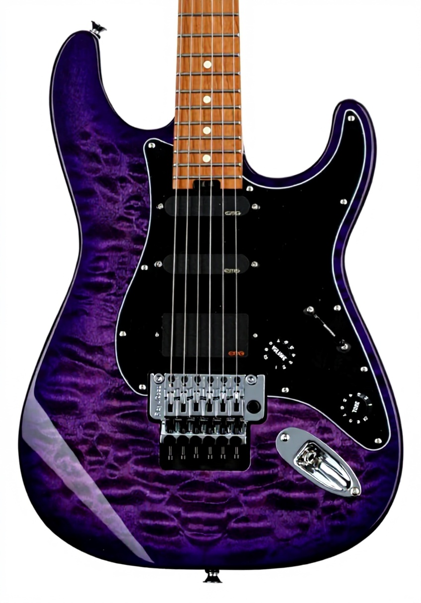 Questa chitarra elettrica Charvel Pro-Mod So-Cal Style 1 HSS combina un corpo in ontano con una configurazione di pick-up HSS (humbucker-single-single) per una versatilità sonora eccezionale. La finitura Transparent Purple Burst esalta la venatura del legno, mentre il manico in acero garantisce una suonabilità fluida e precisa, ideale per performance dinamiche.