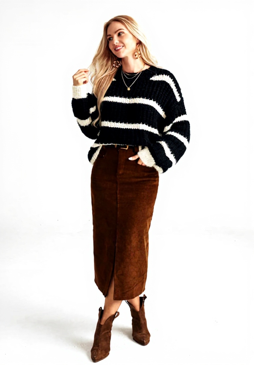 Il maglione è disponibile in Nero, Blu e Beige, tutti con il motivo a righe per un look elegante e coordinabile con diversi capi di abbigliamento.