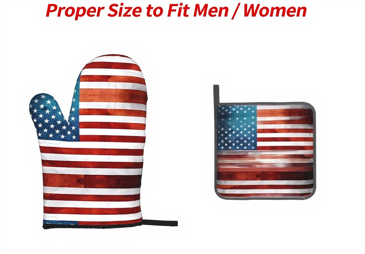 Questo set è composto da 2 guanti da forno e una presina, realizzati in tessuto di poliestere impermeabile che garantisce un isolamento spesso e resistente al calore. Il design vintage con bandiera americana aggiunge un tocco di stile, mentre la finitura di alta qualità assicura protezione duratura contro scottature e ustioni durante l’uso in cucina.