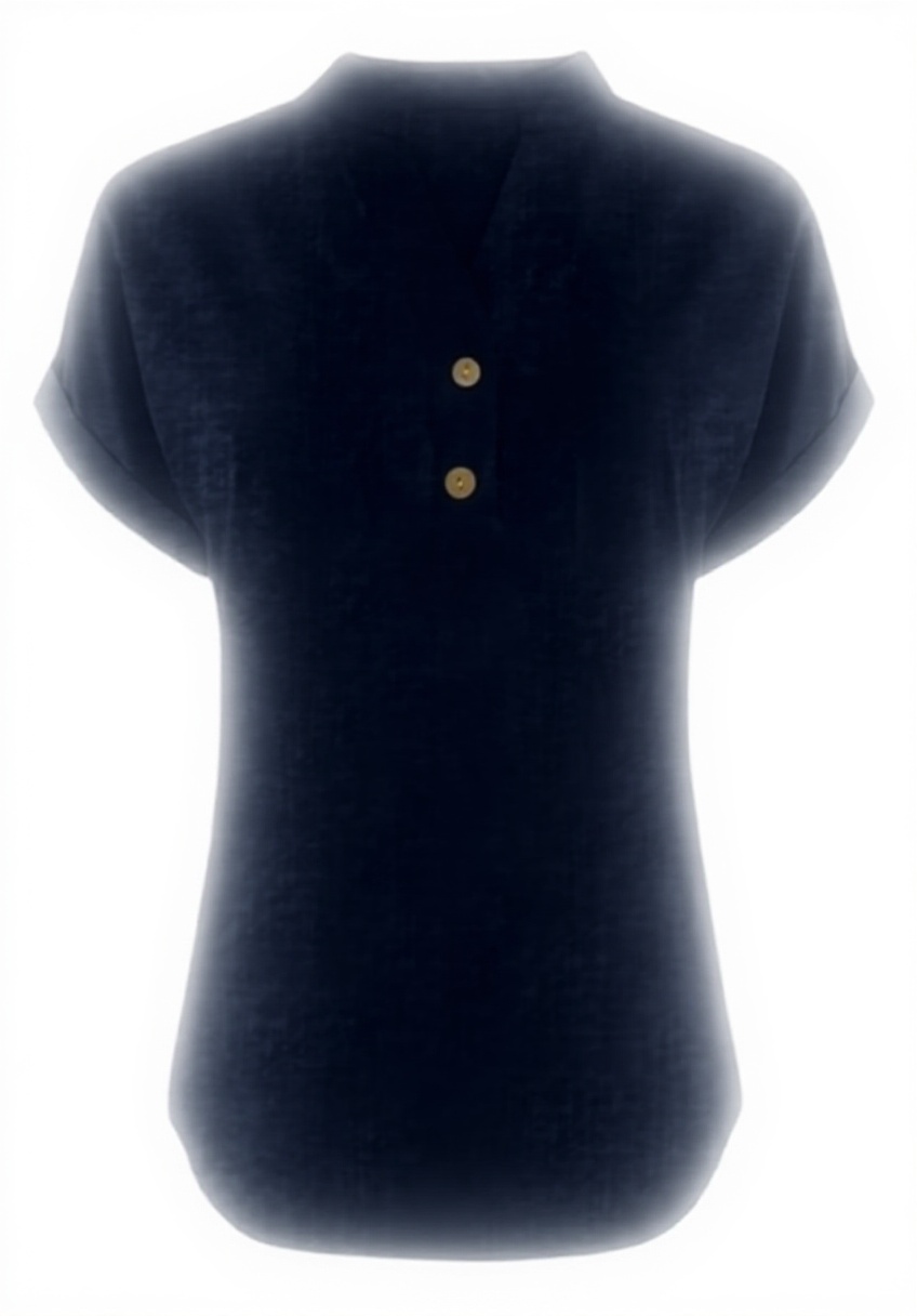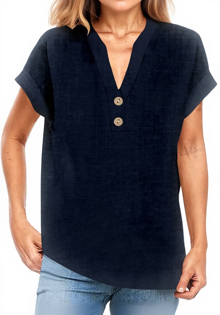Questa maglietta da donna unisce cotone e lino per una vestibilità comoda e traspirante, con scollo a V che dona eleganza e maniche arrotolate per un tocco casual. I bottoni decorativi aggiungono un dettaglio raffinato, rendendola ideale per look versatili e quotidiani.