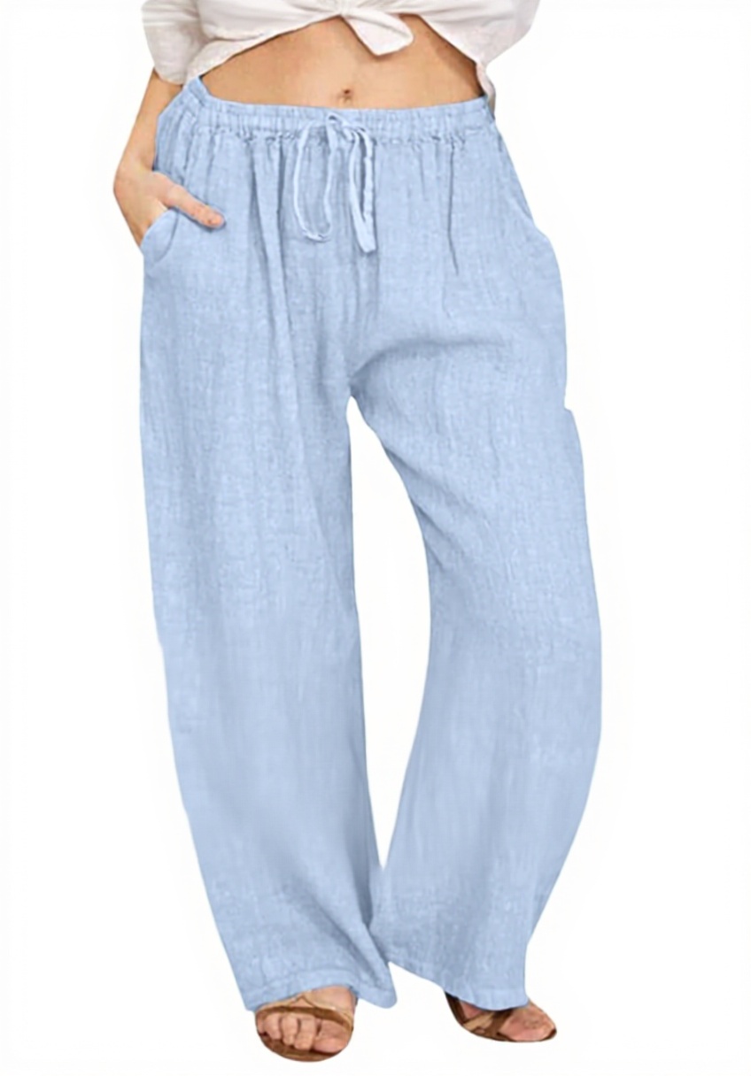Questi pantaloni da donna uniscono cotone e lino per una vestibilità fresca e traspirante, con vita alta elastica e coulisse regolabile per un comfort ottimale. Il design chic ed elegante li rende versatili per diverse occasioni, mentre la tela resistente assicura durata nel tempo.